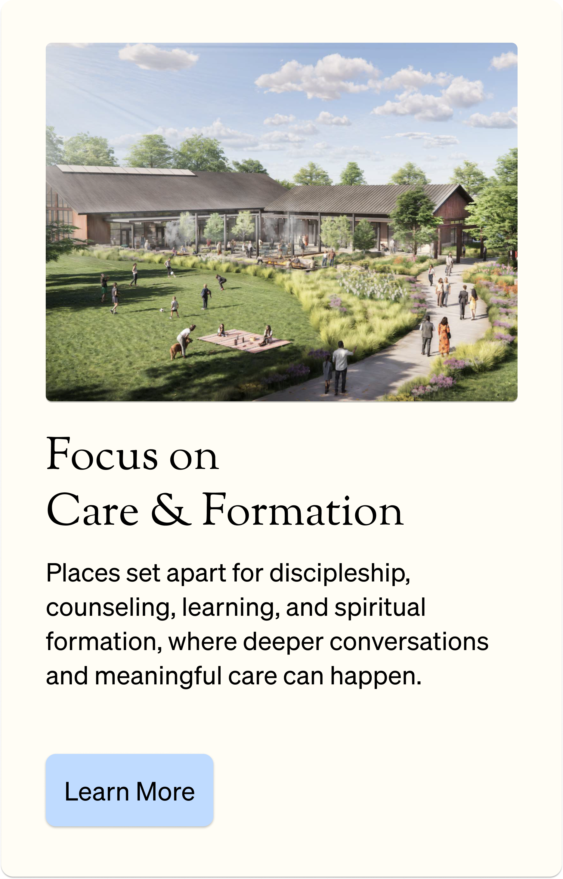 Care & Formation – places set apart for discipleship, counseling, learning, and spiritual formation, where deeper conversations and meaningful care can happen.
